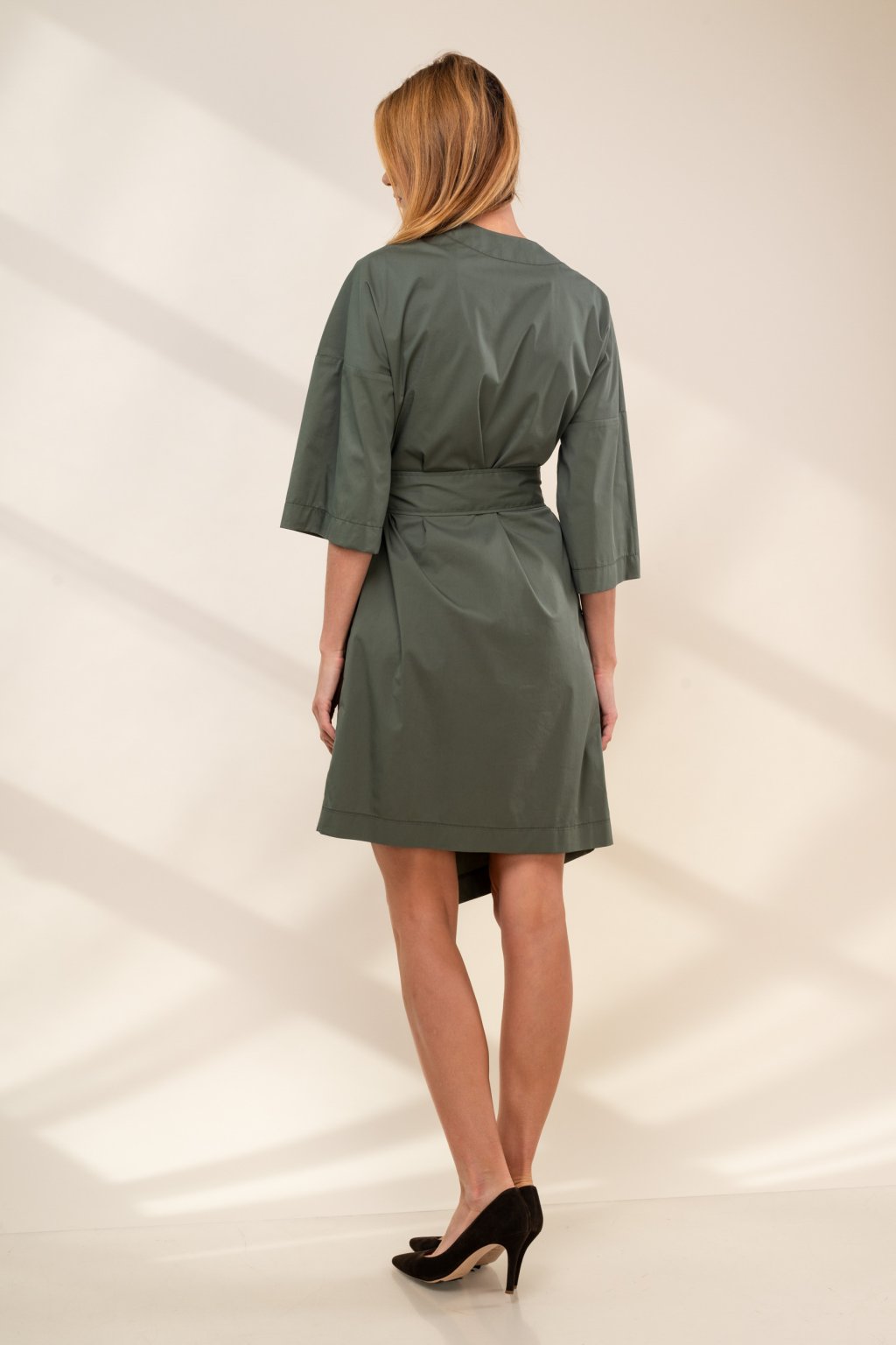Kimonový strih. Mierne rozšírený 3/4 rukáv. Vrchný predný diel je strihaný asymetricky. Poistka v podobe šnúrky je našitá na spodnom prednom diele kimonových šiat a umožňuje na boku uviazať spodný predný diel so zadným dielom, aby sa šaty nežiadúco neotvárali. Opasok vo farbe šiat.