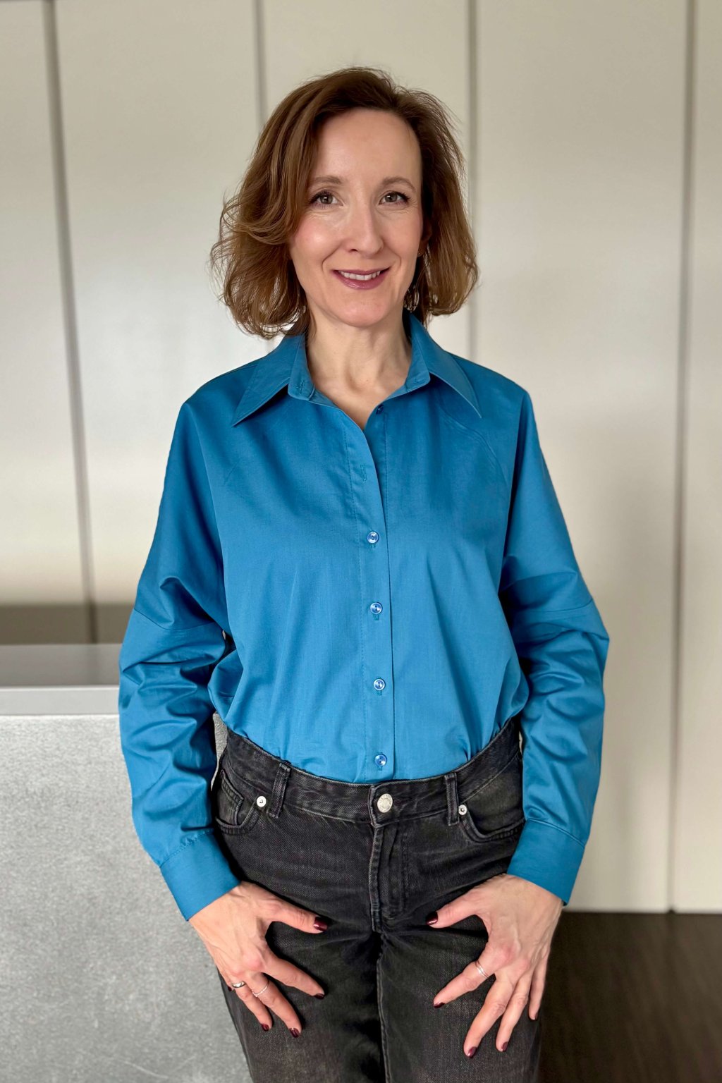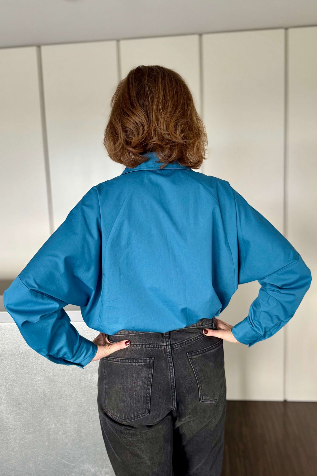 Košeľa s netopierími raglánovými rukávmi zakončenými manžetou na dva gombíky.