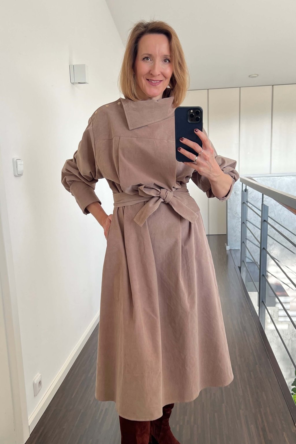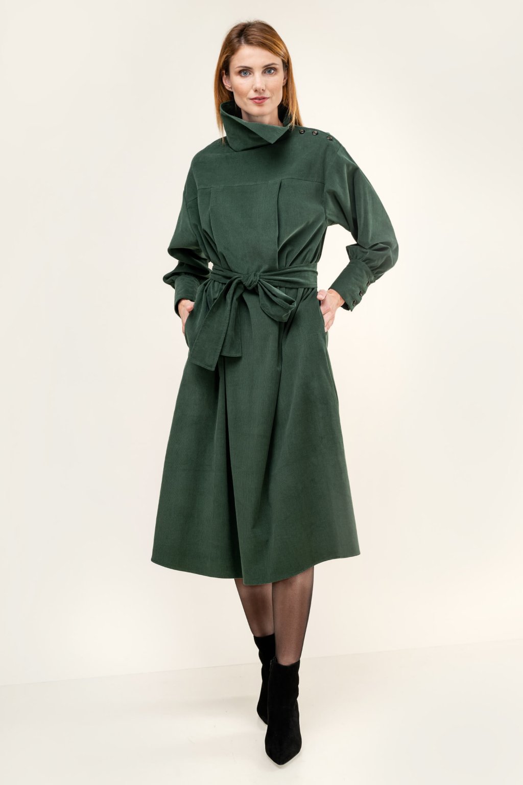 Oversize šaty s gombíkmi na ramene z príjemného baby cordu. Šaty majú zapínanie na tri gombíky na ramene, stojačikový límec, ktorý si môžete rozopnúť a ovinúť. Dlhý rukáv je ukončený výraznou manžetou s tromi gombíkmi. Skryté bočné vrecká.