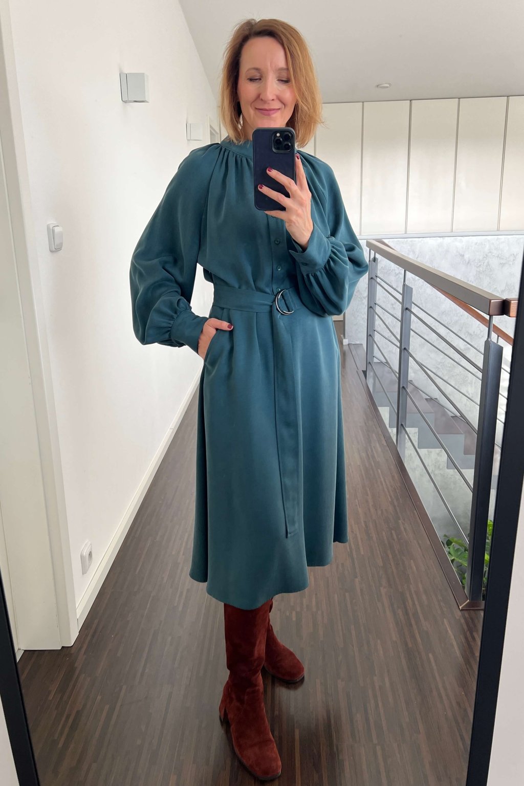 Elegantné šaty s nariaseným raglánovým rukávom a stojačikom. Horný diel je nariasený po celom obvode okolo stojačika so zapínaním na gombíky. Výrazné puf rukávy sú zakončené širokou manžetou s jedným gombíkom. Sukňa v tvare A s klinovými vreckami. Opasok vo farbe šiat s kovovou prackou.